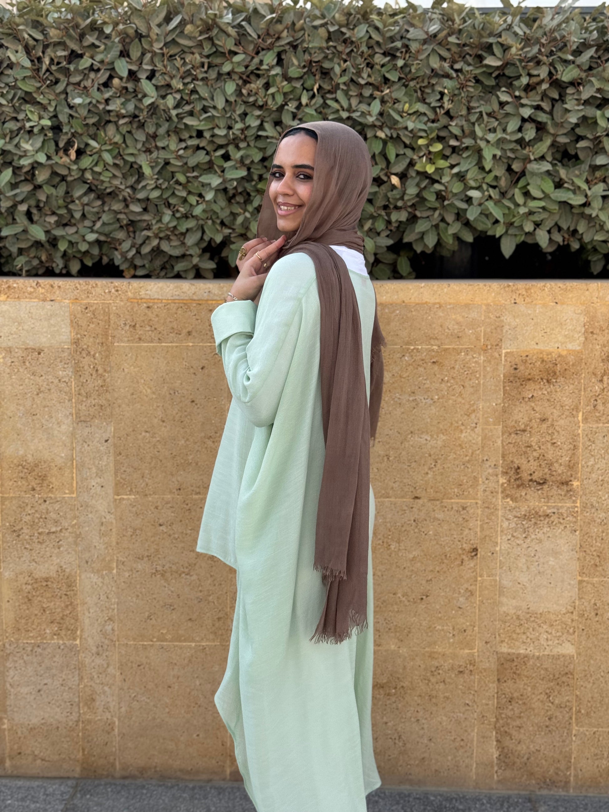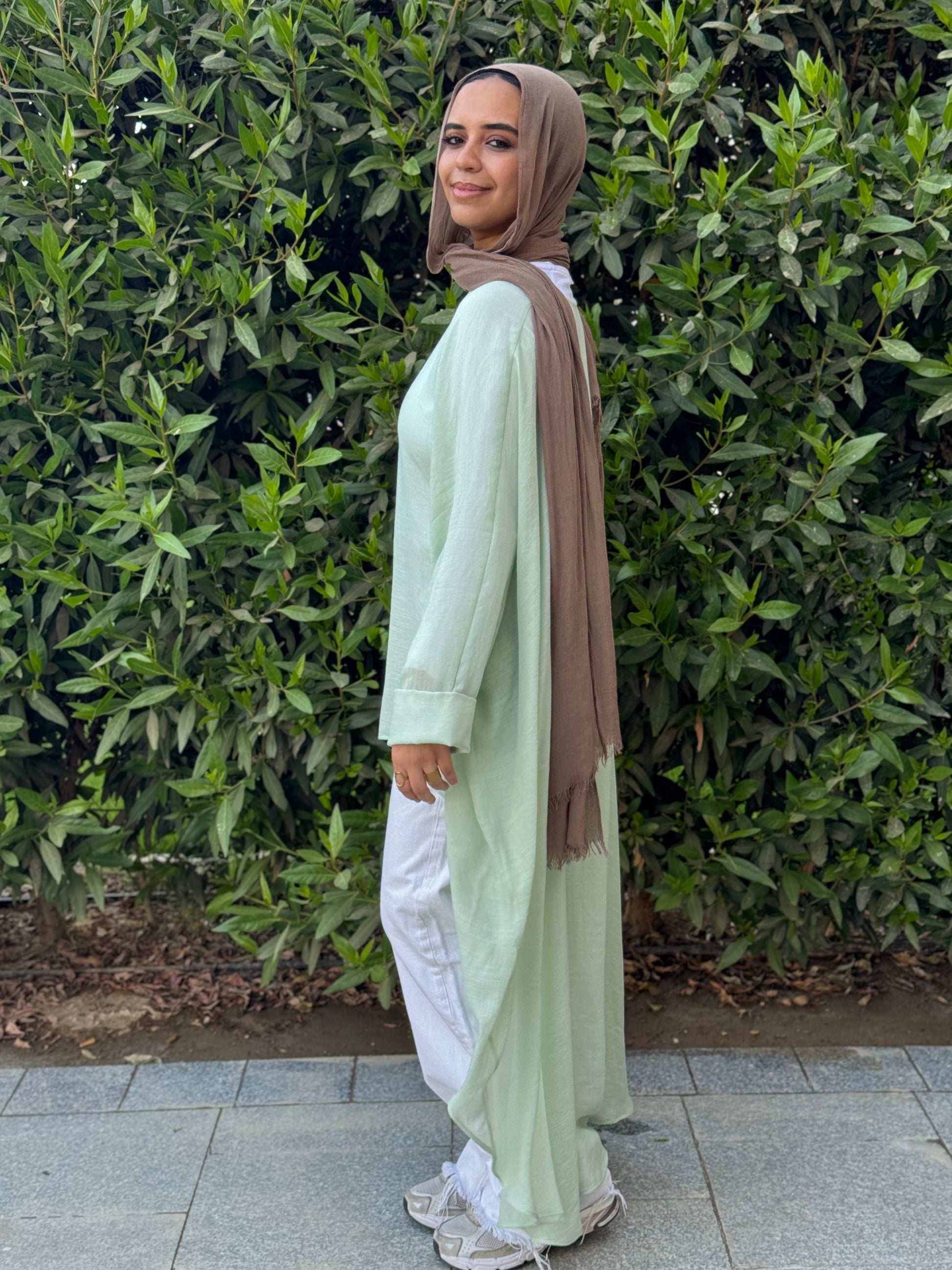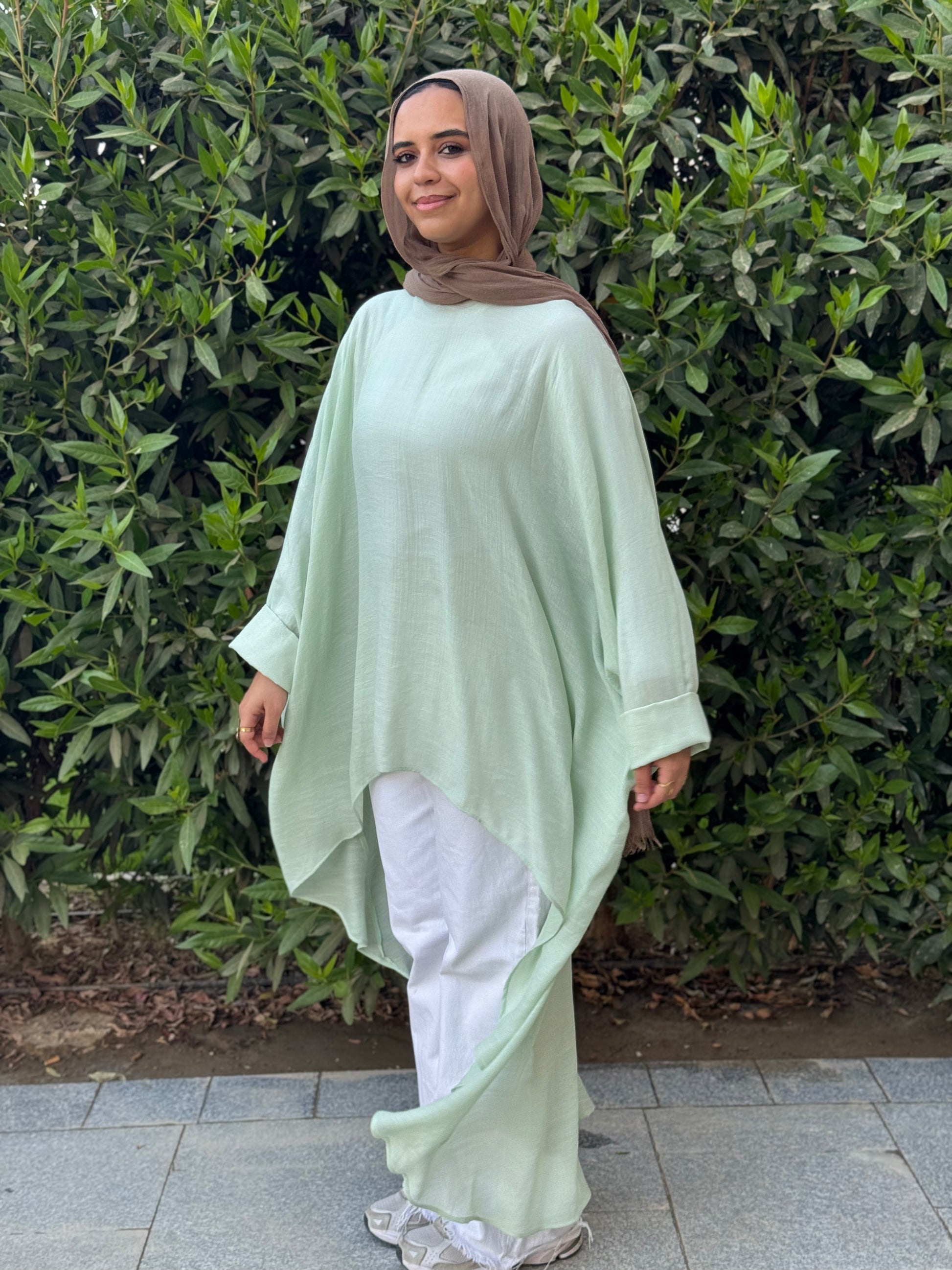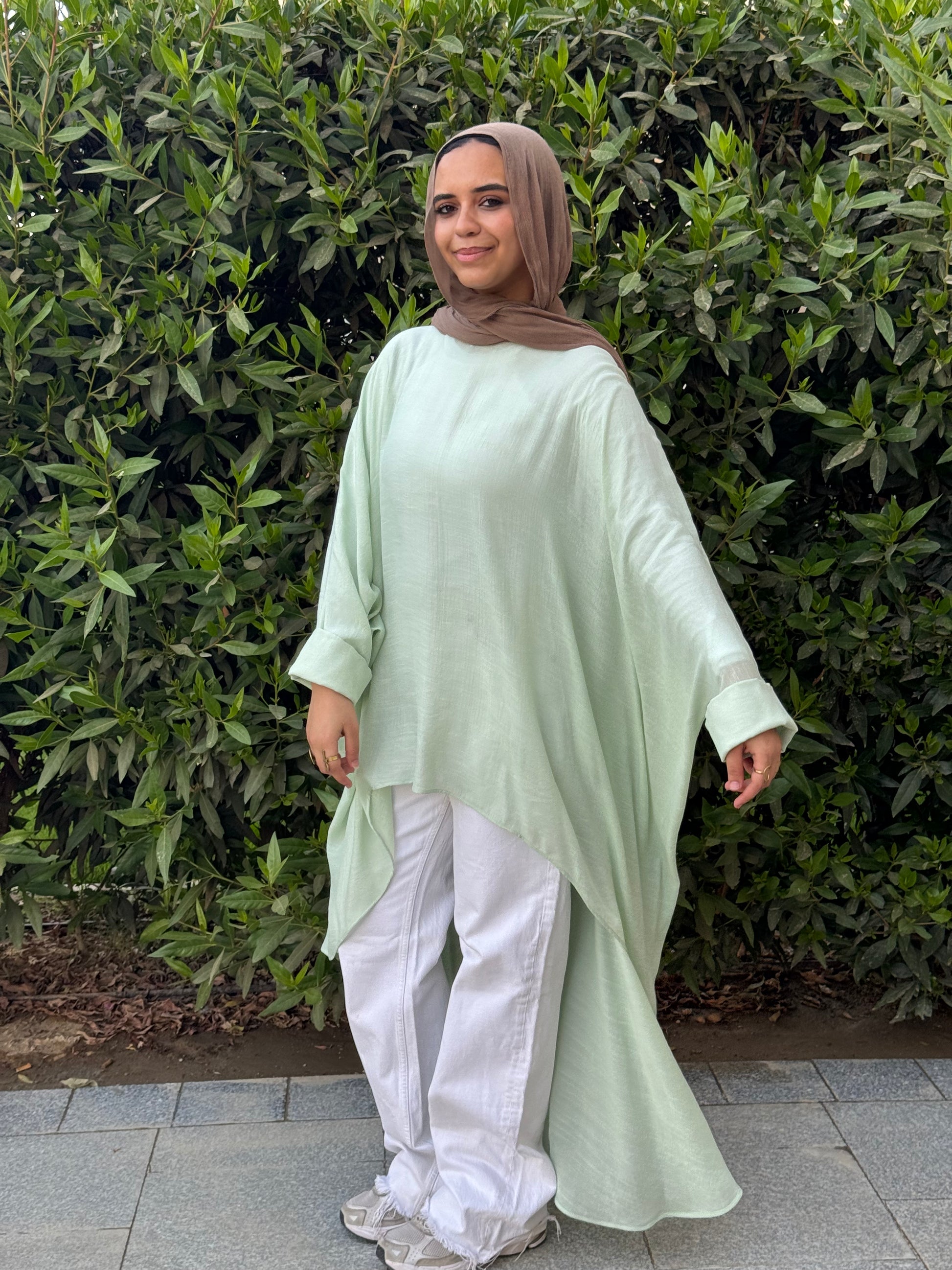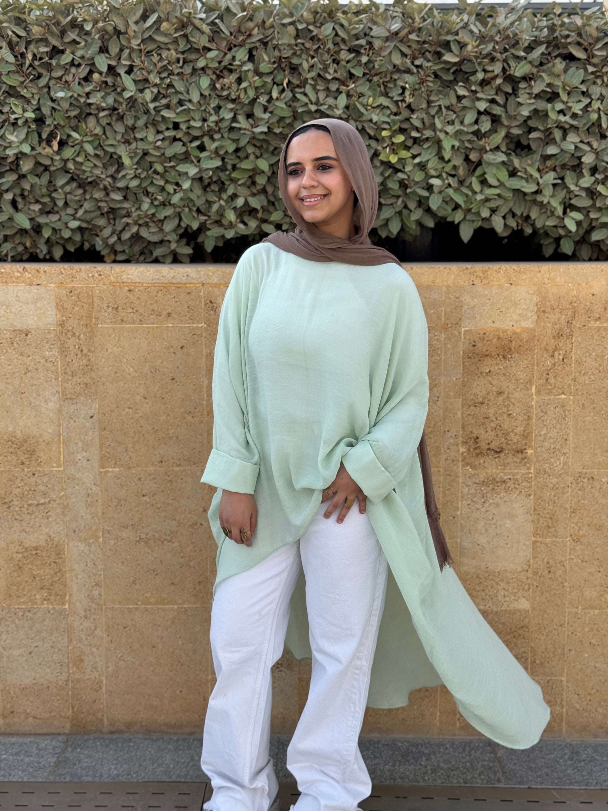 This oversized low-high top flows with ease, featuring a modern side slit and timeless modesty.