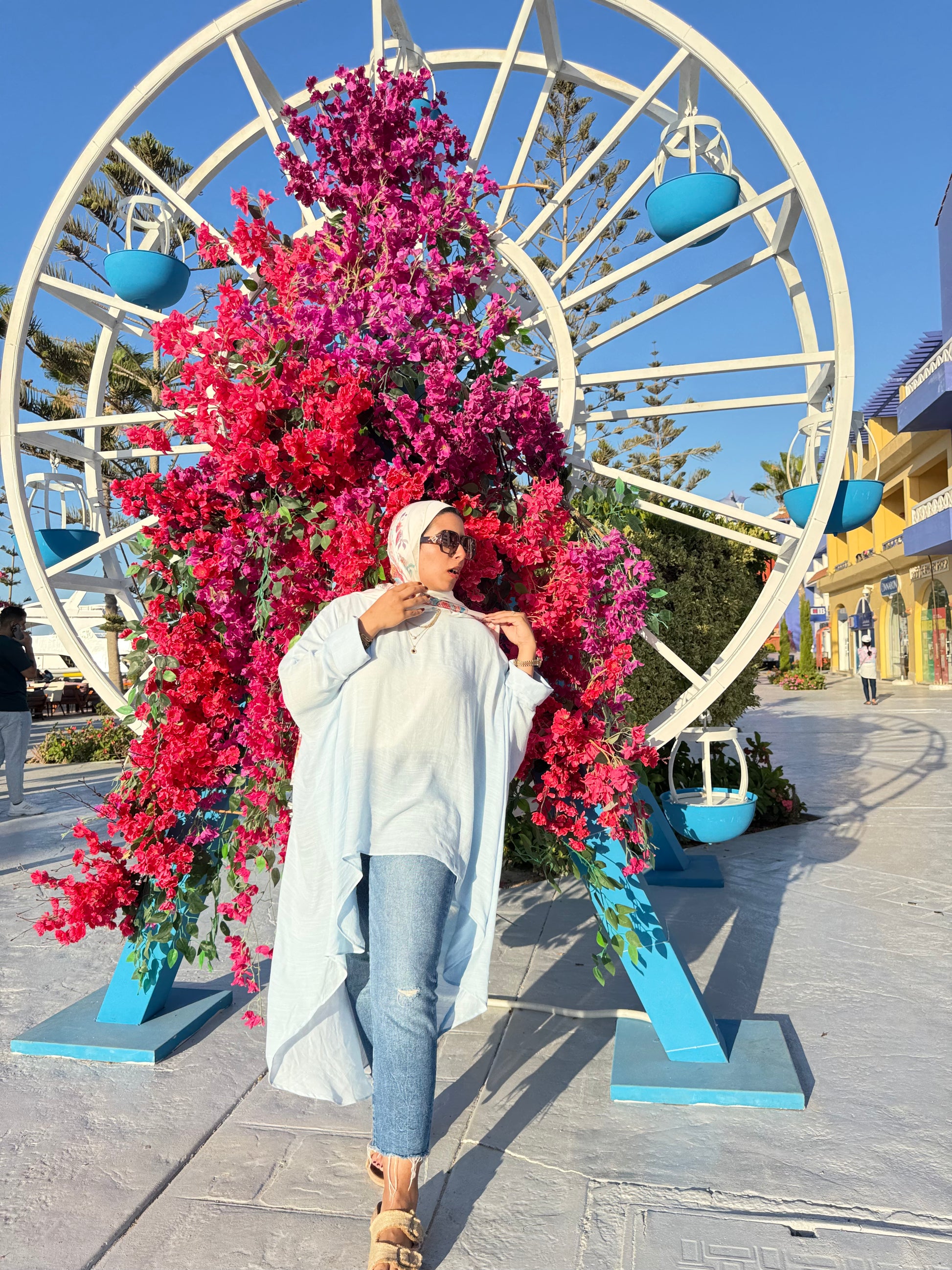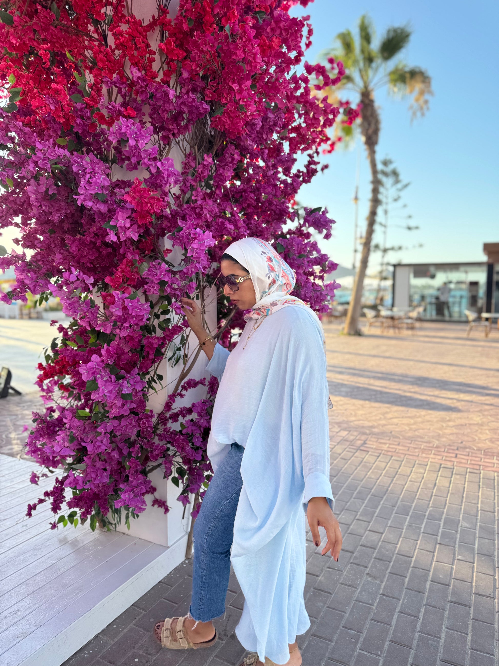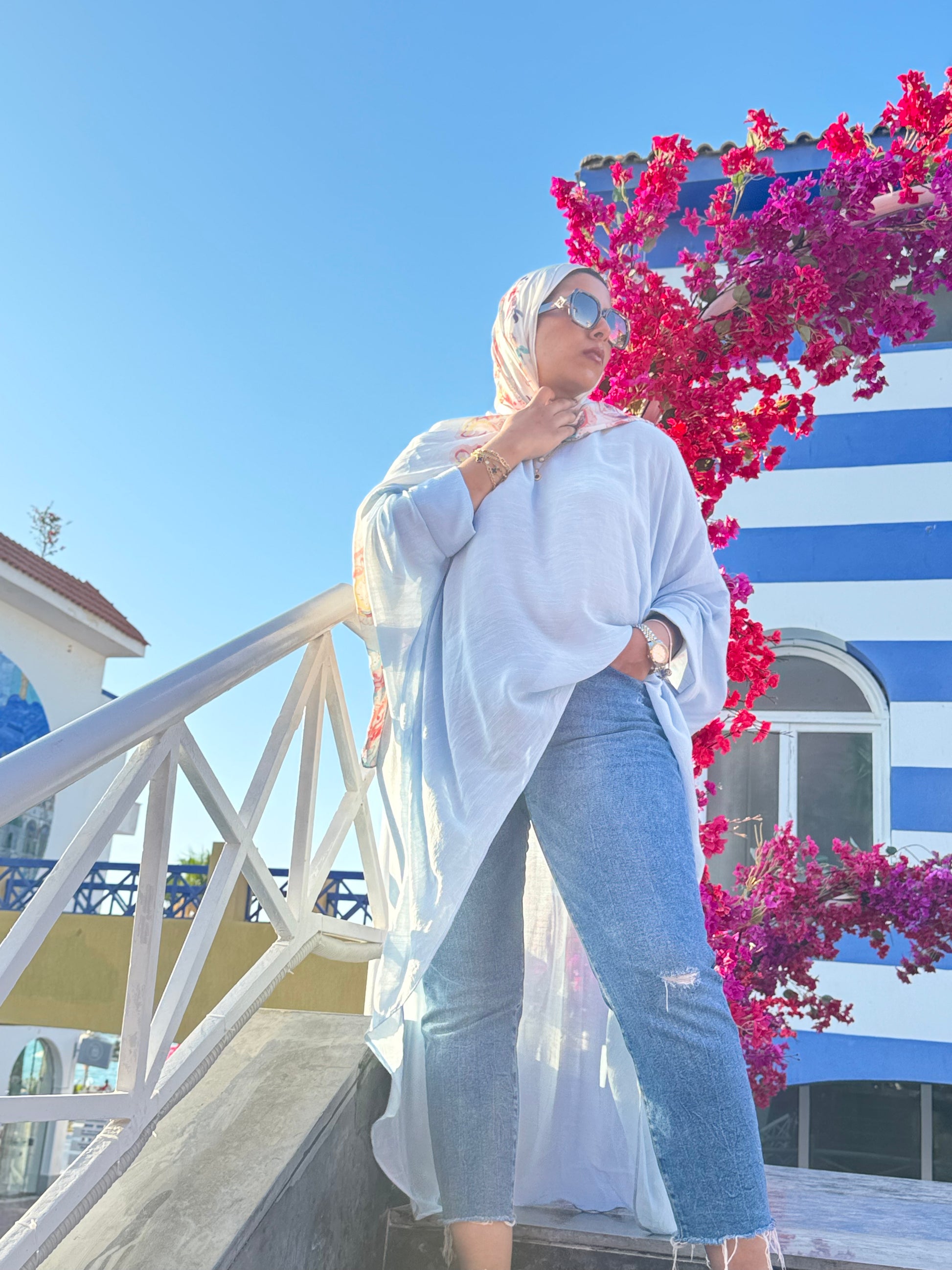 This oversized low-high top flows with ease, featuring a modern side slit and timeless modesty.