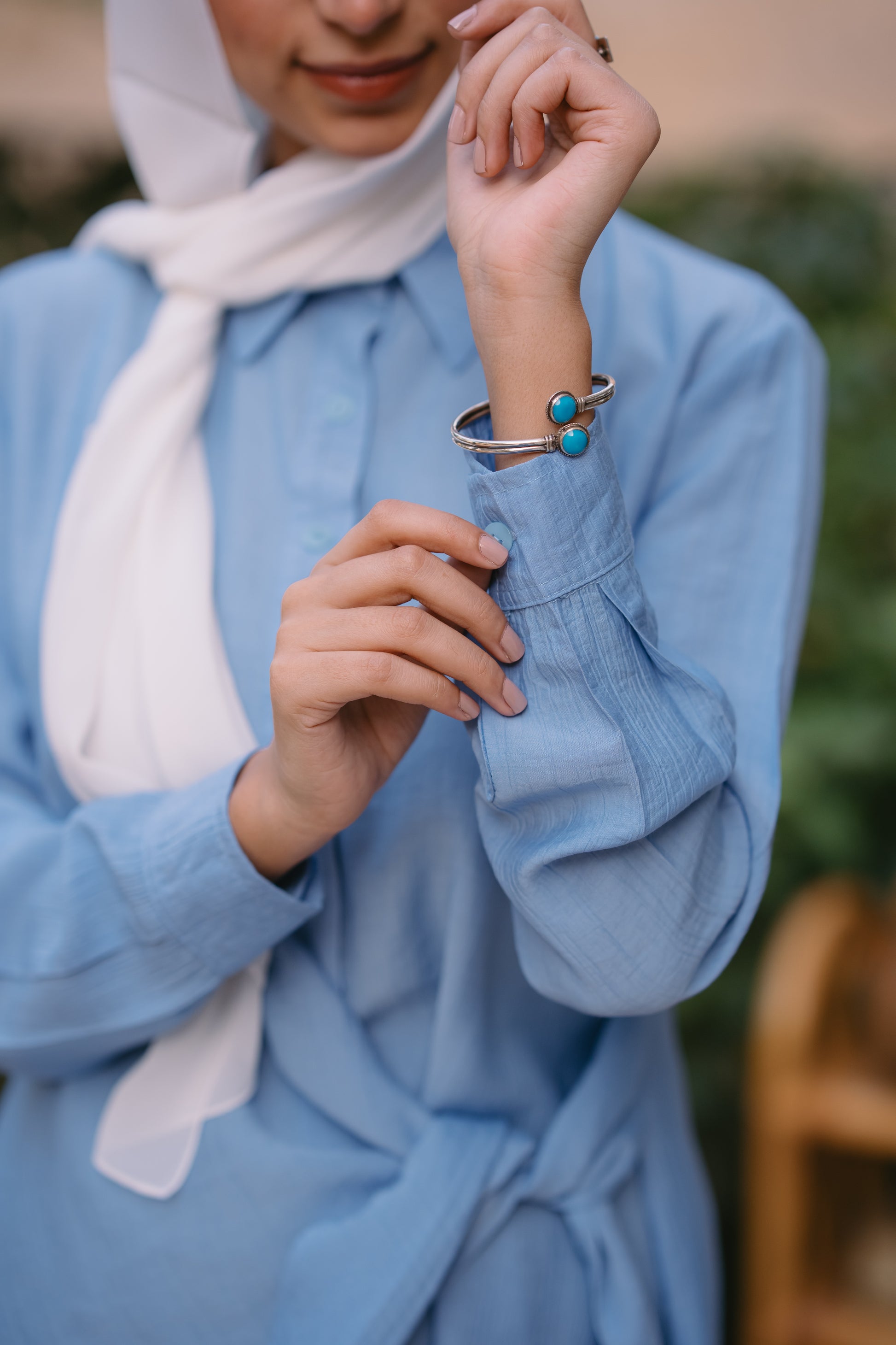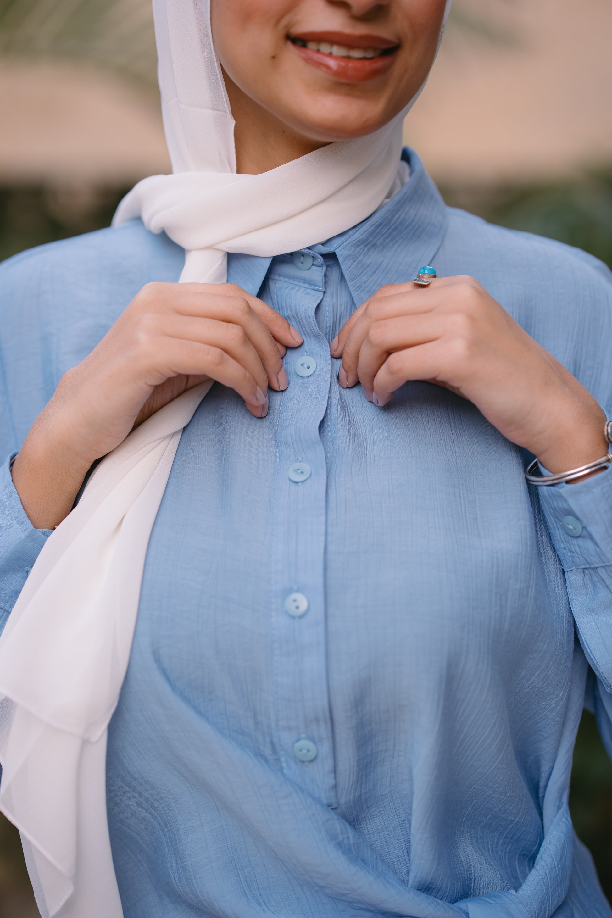Redefine elegance with this blouse featuring a refined knot detail at the waist. Crafted from a soft, textured fabric with a subtle sheen, this long-sleeve shirt combines timeless modesty with contemporary flair. The asymmetrical drape adds dynamic movement, while the button-down front maintains a polished, versatile look.