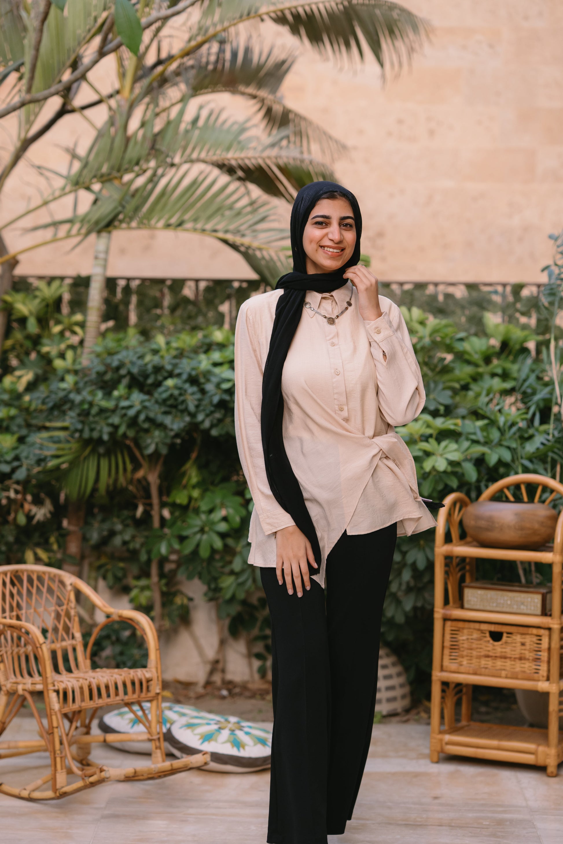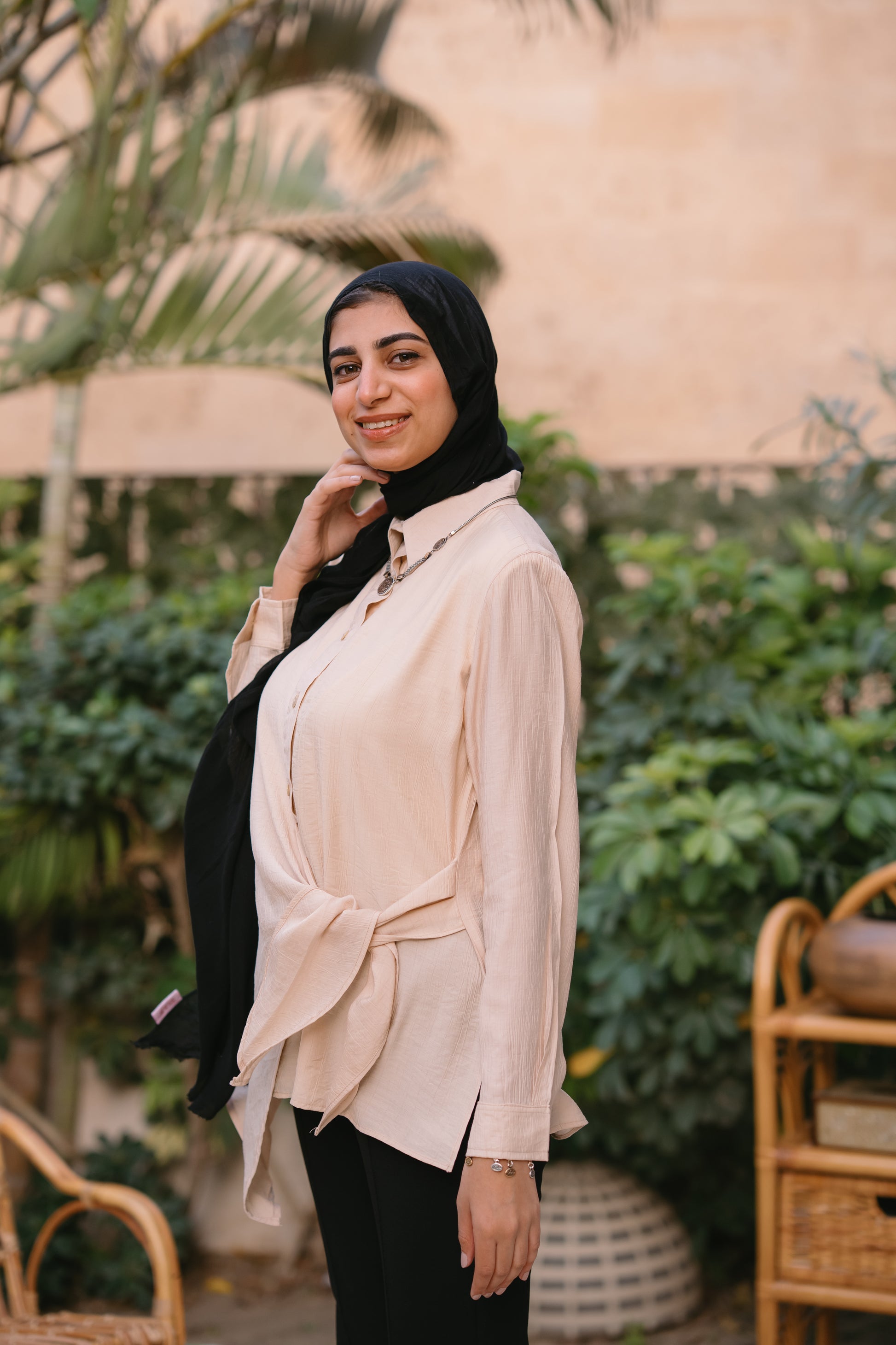 Redefine elegance with this blouse featuring a refined knot detail at the waist. Crafted from a soft, textured fabric with a subtle sheen, this long-sleeve shirt combines timeless modesty with contemporary flair. The asymmetrical drape adds dynamic movement, while the button-down front maintains a polished, versatile look.