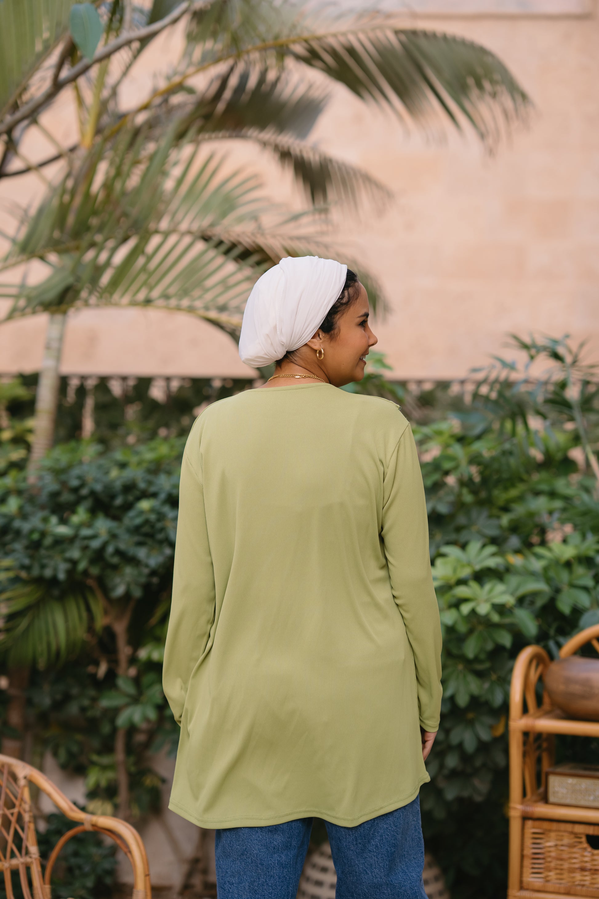 Stay effortlessly elegant in this top, designed for both comfort and style. Crafted from soft, breathable fabric, the top features a unique wrap-style that adds a modern twist to a classic silhouette. The long sleeves and relaxed fit provide modest coverage without sacrificing grace or movement.